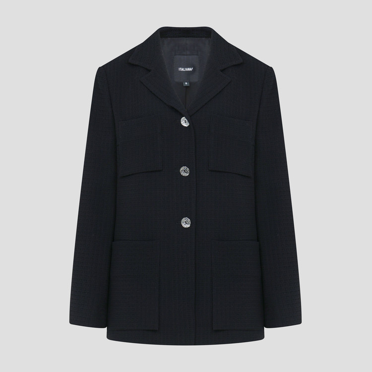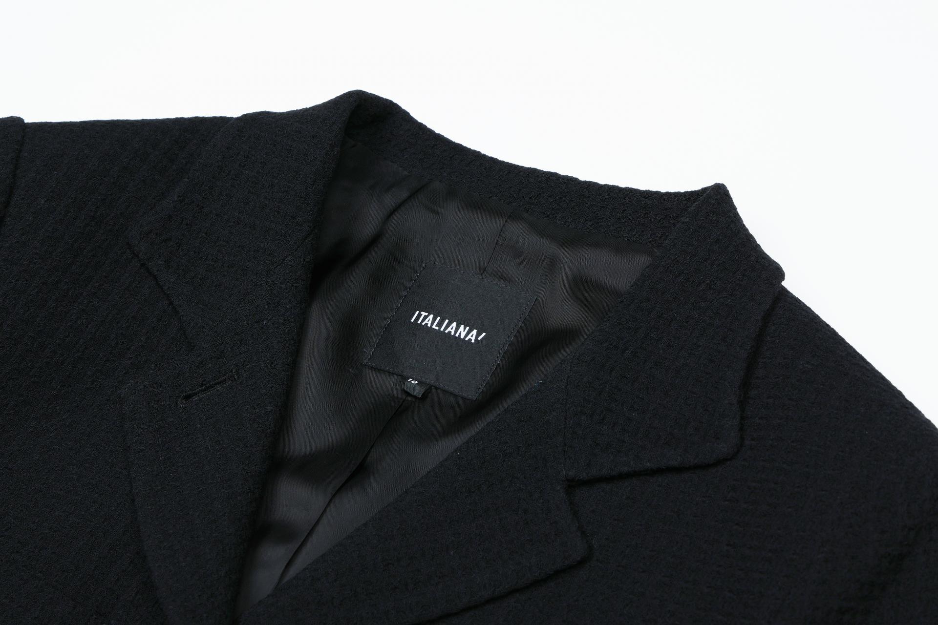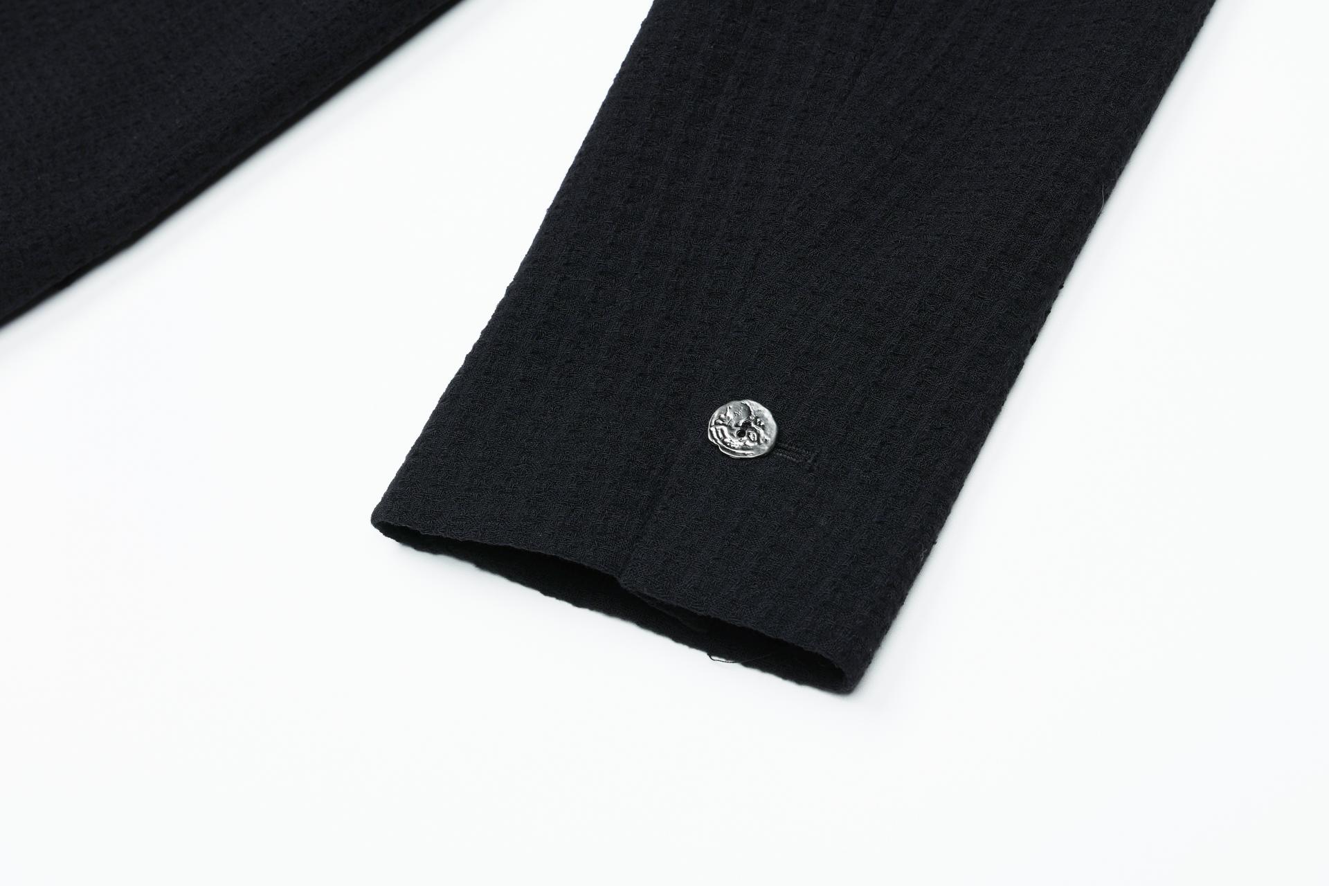 솔리드 블랙 원단은 울 라이크라 원단으로 울원사를 트위드처럼 섬세하게 짜서 조직감이 돋보이는 수입원단입니다