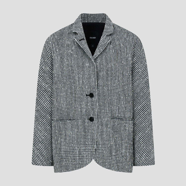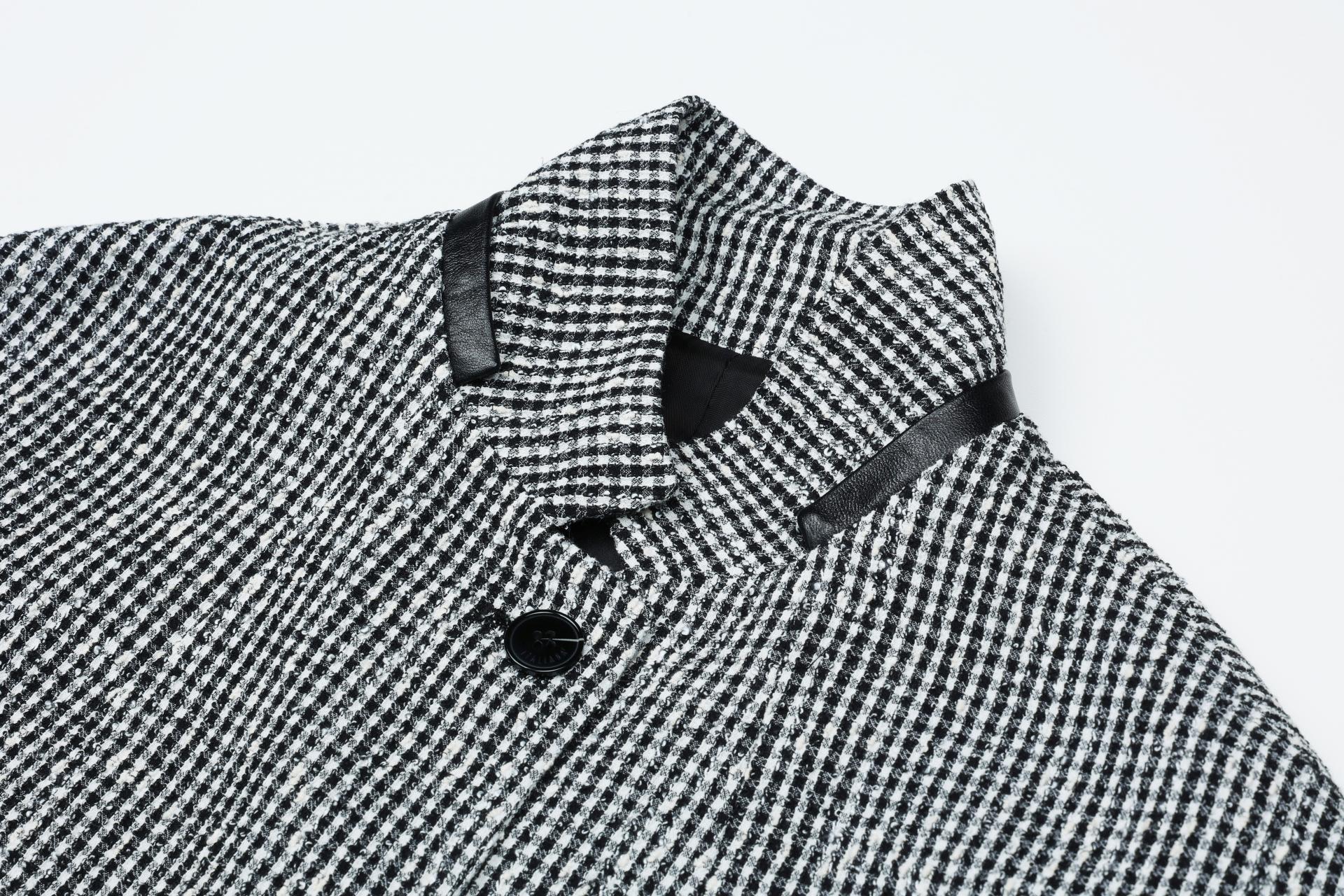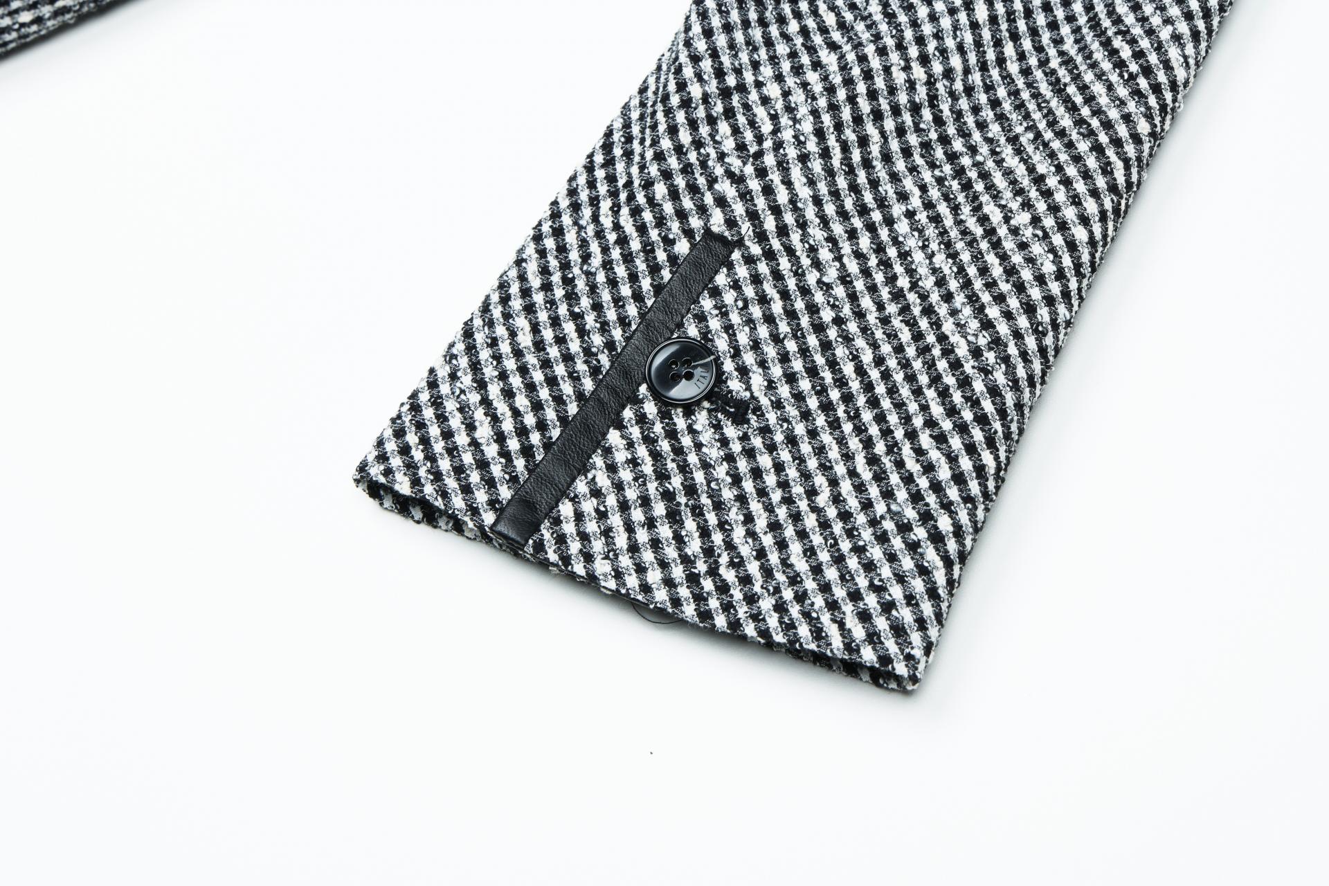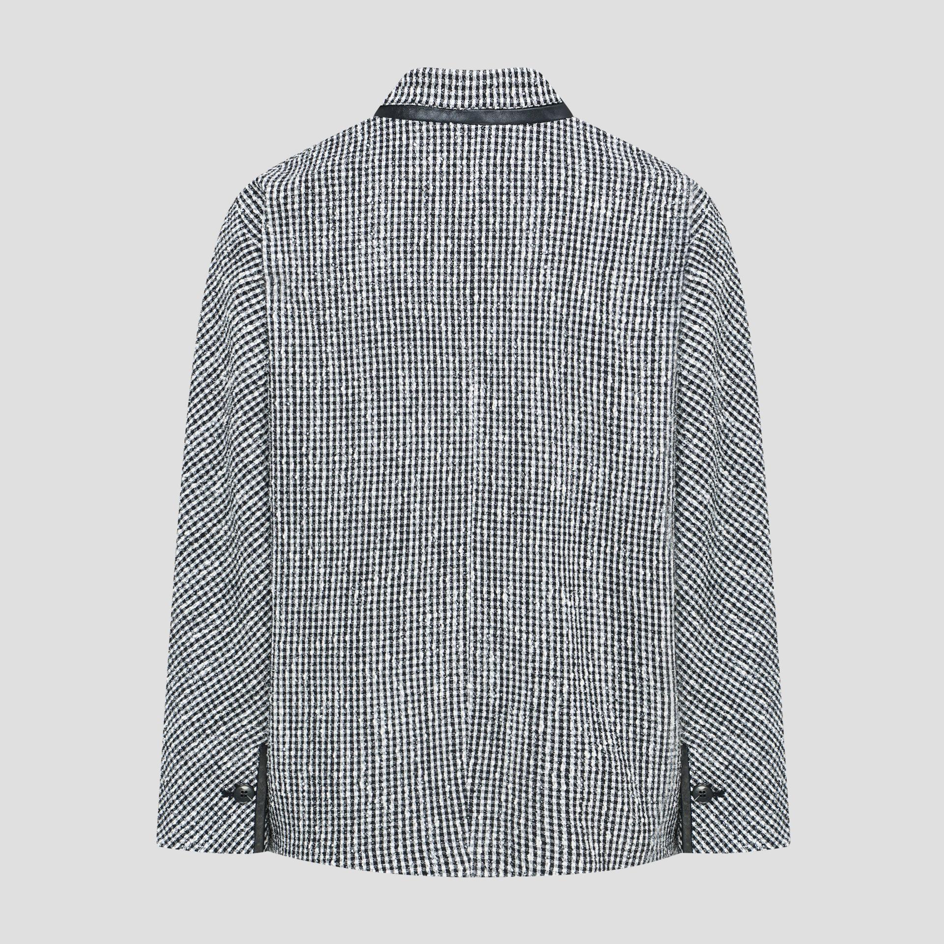 기본의 2버튼 형태의 자켓이며 조직감 있는 소재로 고급스러운 느낌을 자아내며, 소매와 카라에 양가죽 콤비 작업이 추가되어 무드를 더합니다.