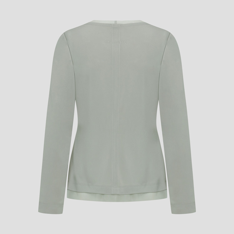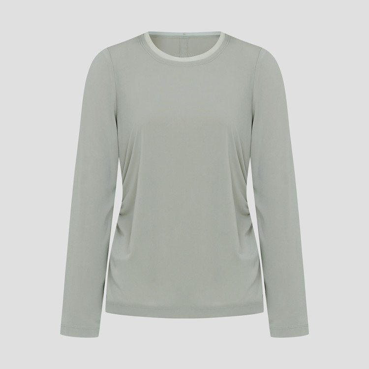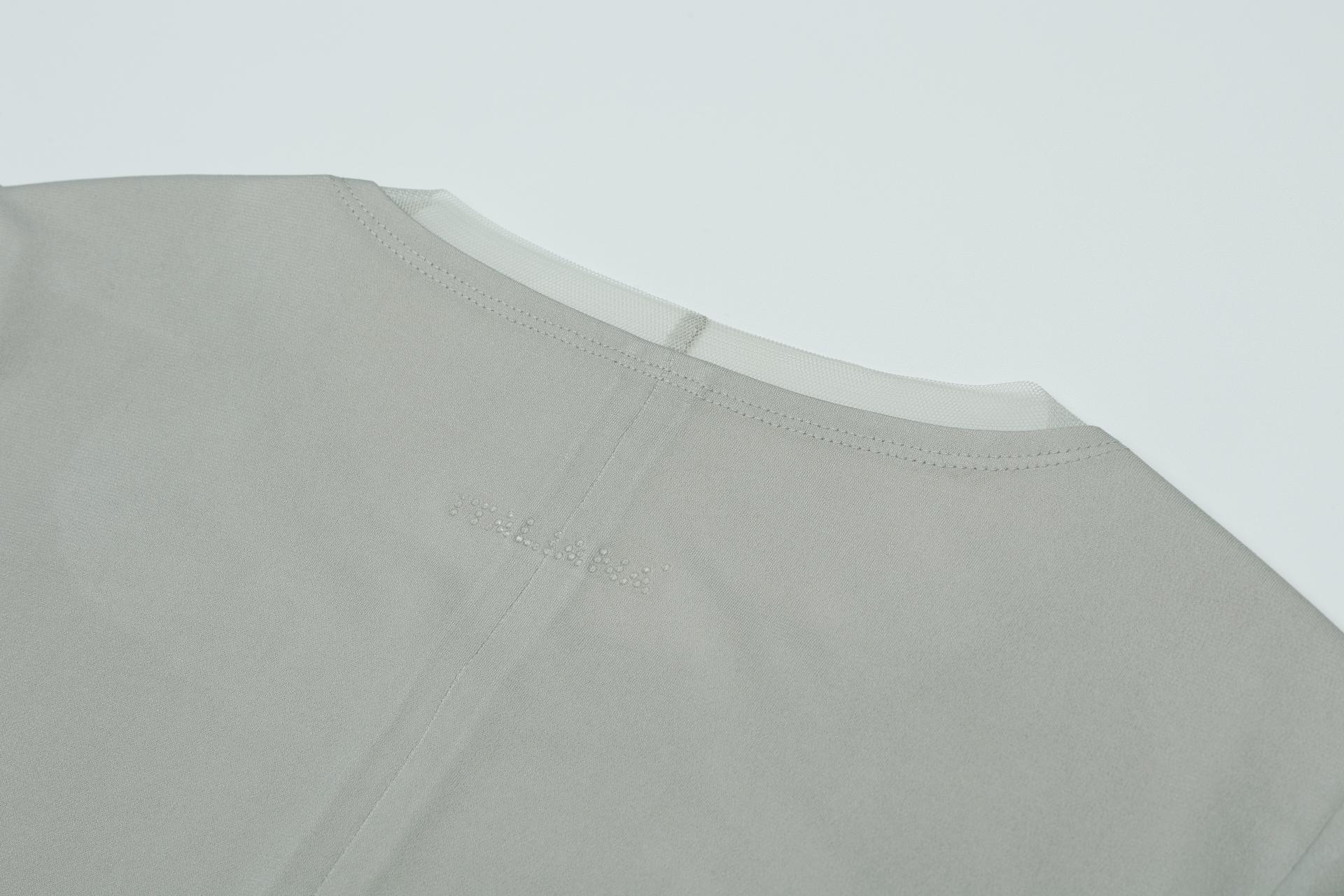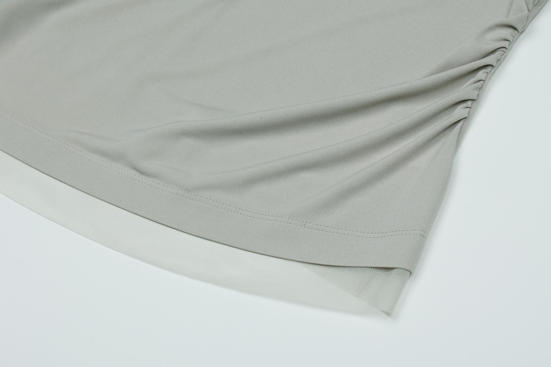 매쉬 소재가 네크와 밑단에 레이어드 되어 포인트가 되며, 허리 라인의 셔링은 허리를 슬림하게 보이게 해줍니다.