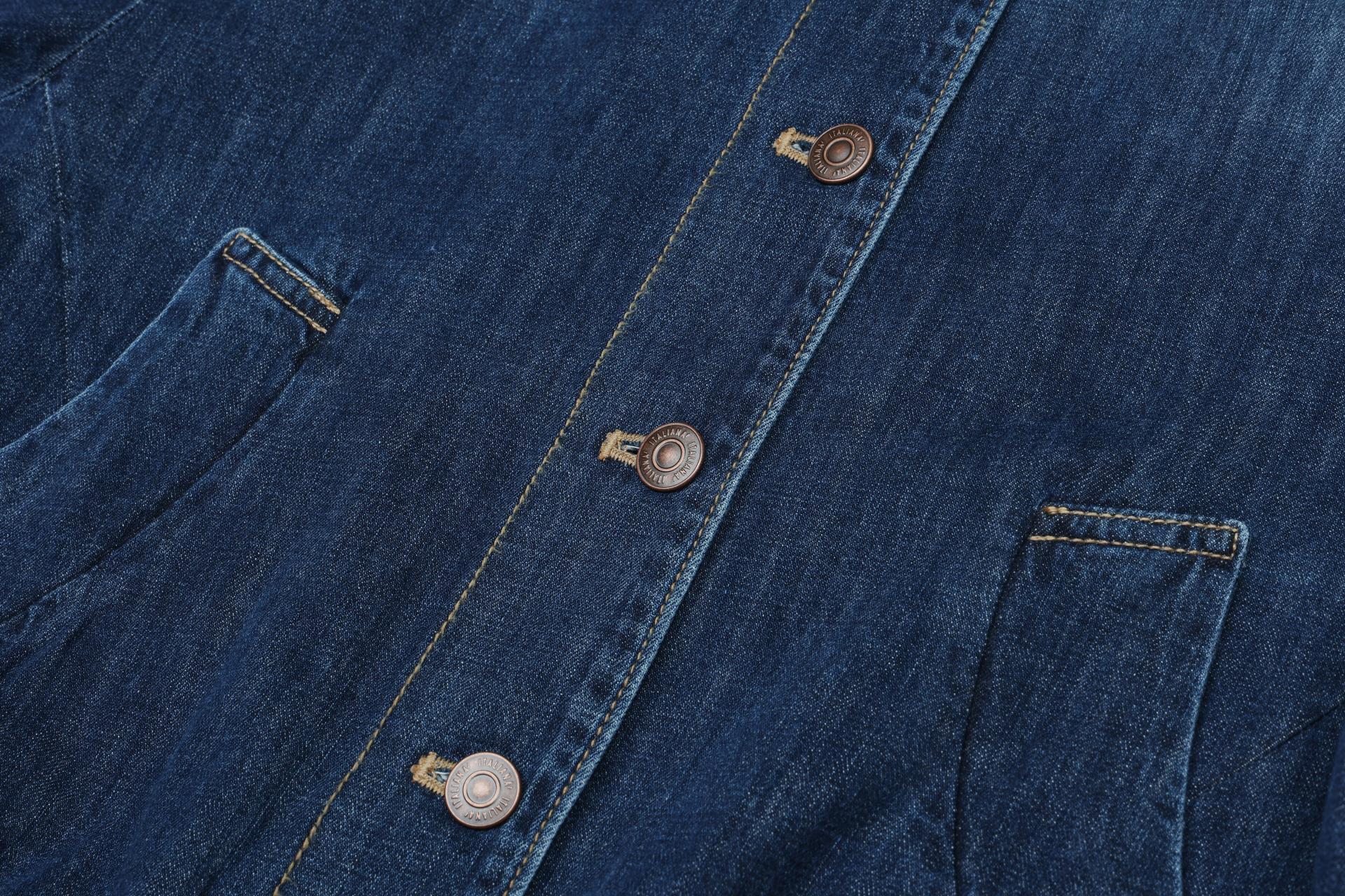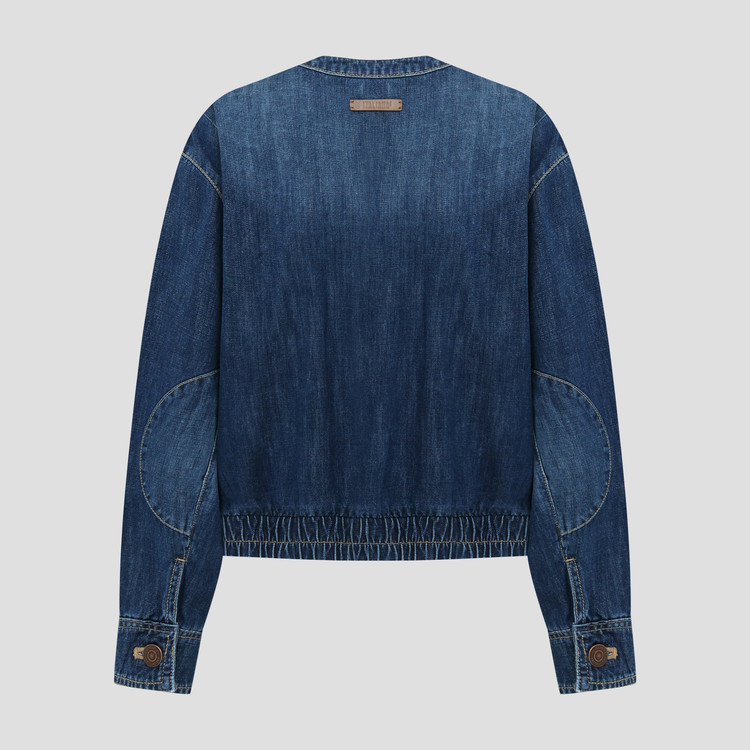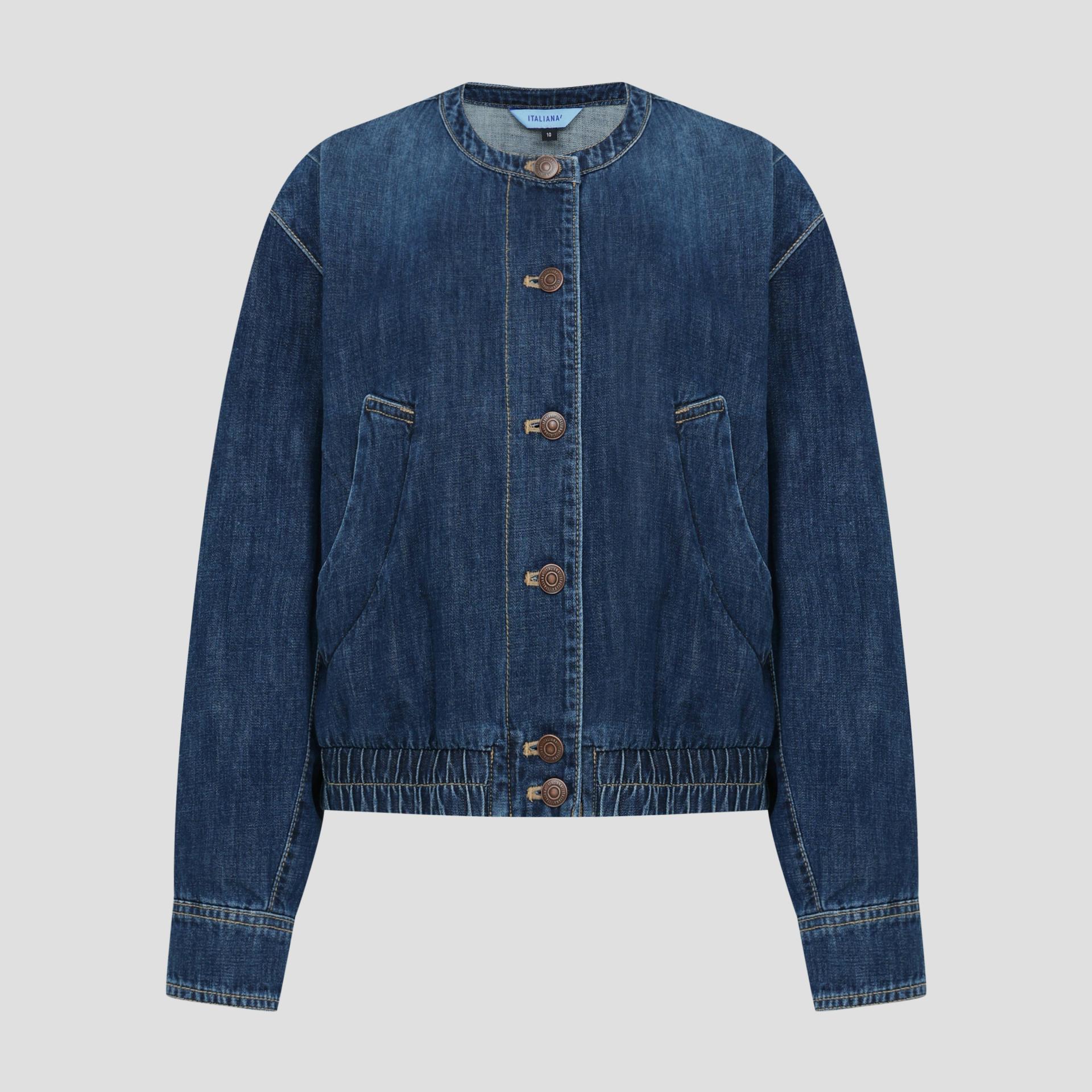 깔끔한 칼라리스 디자인과 크롭한 기장감이 어우러지는 데님 자켓입니다.