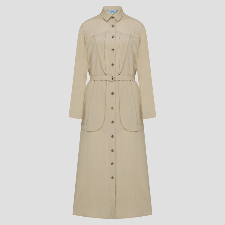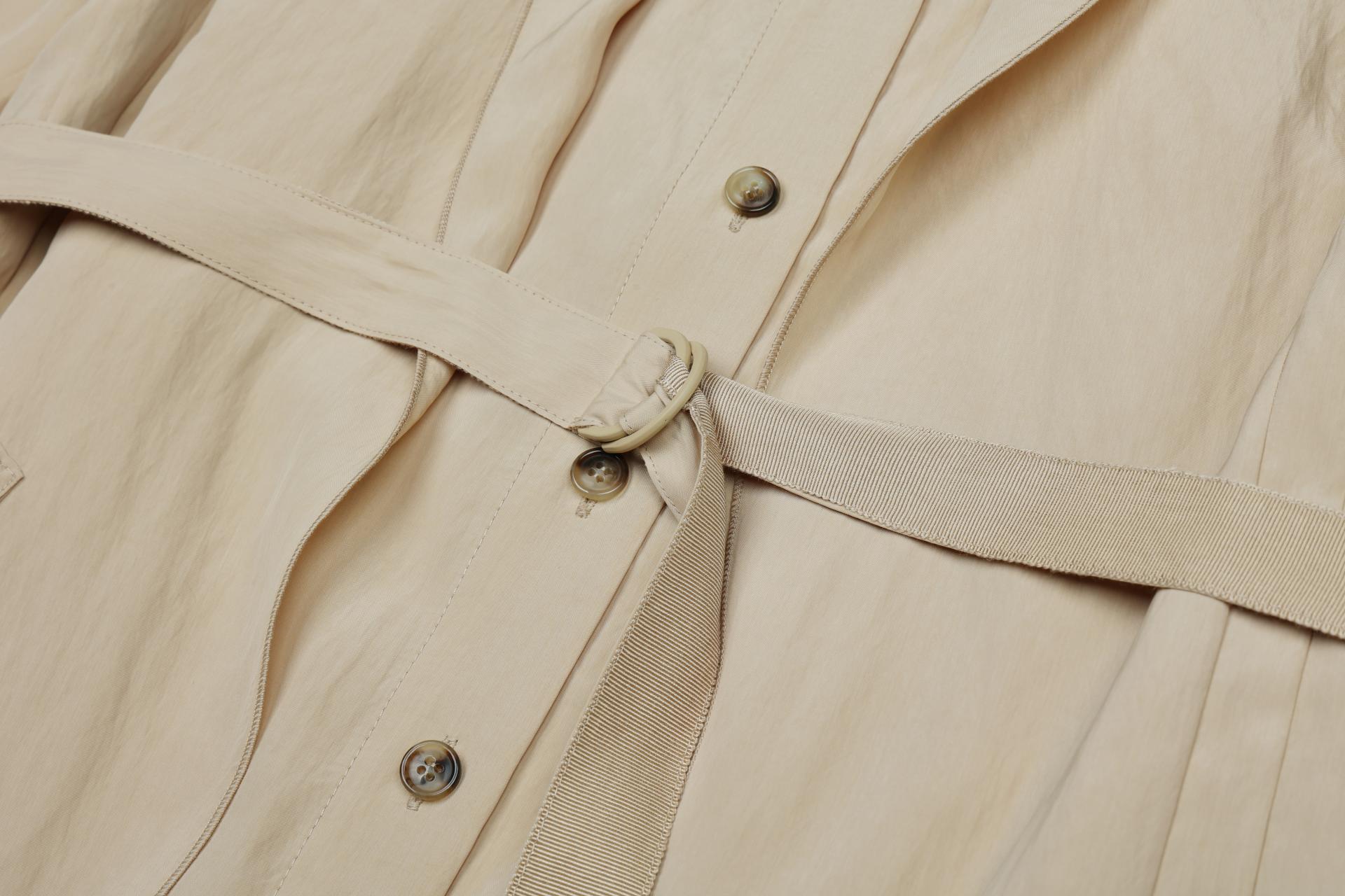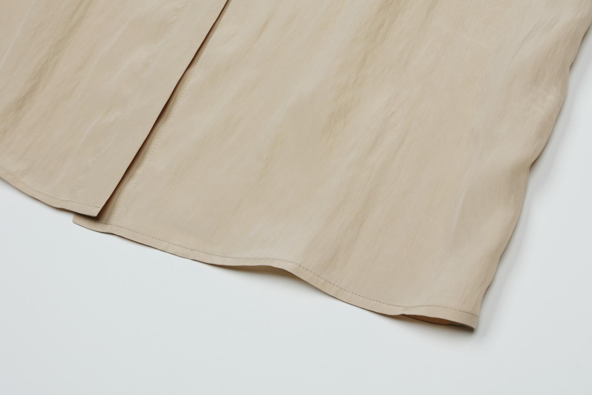 광택감이 돋보이는 비스코스&나일론 혼방의 셔츠형 바바리로 앞 오픈 및 클로즈를 통해 바바리 느낌으로 혹은 원피스 느낌으로 착용하실 수 있습니다.