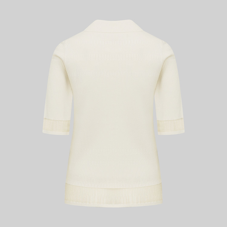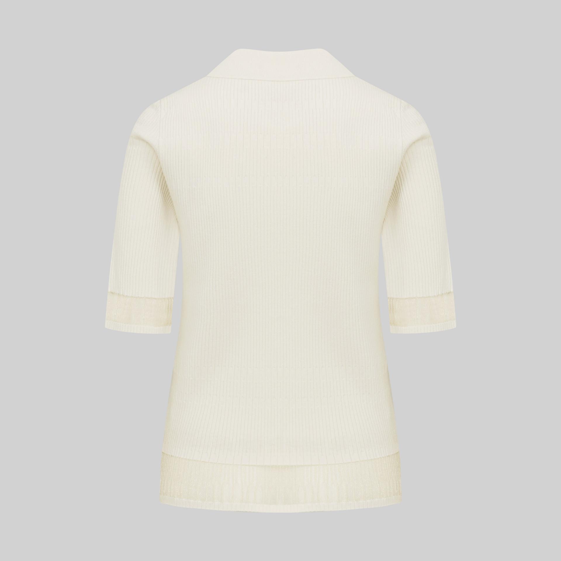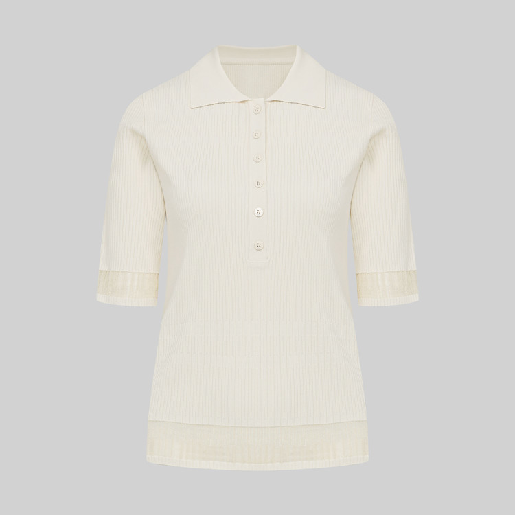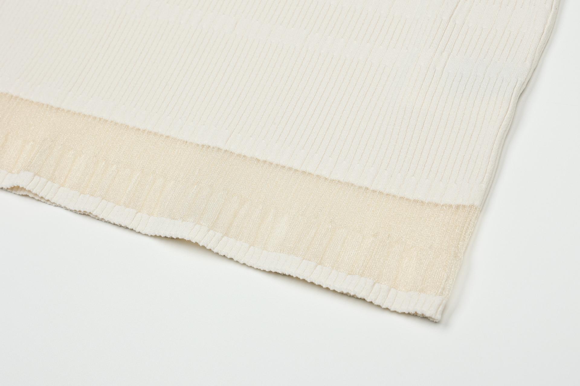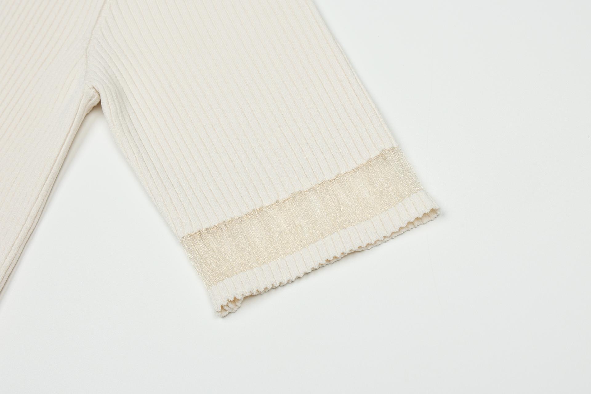 팔꿈치까지 오는 안정적인 소매장으로 투명사가 소맷단과 밑단에 위치하며 여성스러운 무드를 자아냅니다