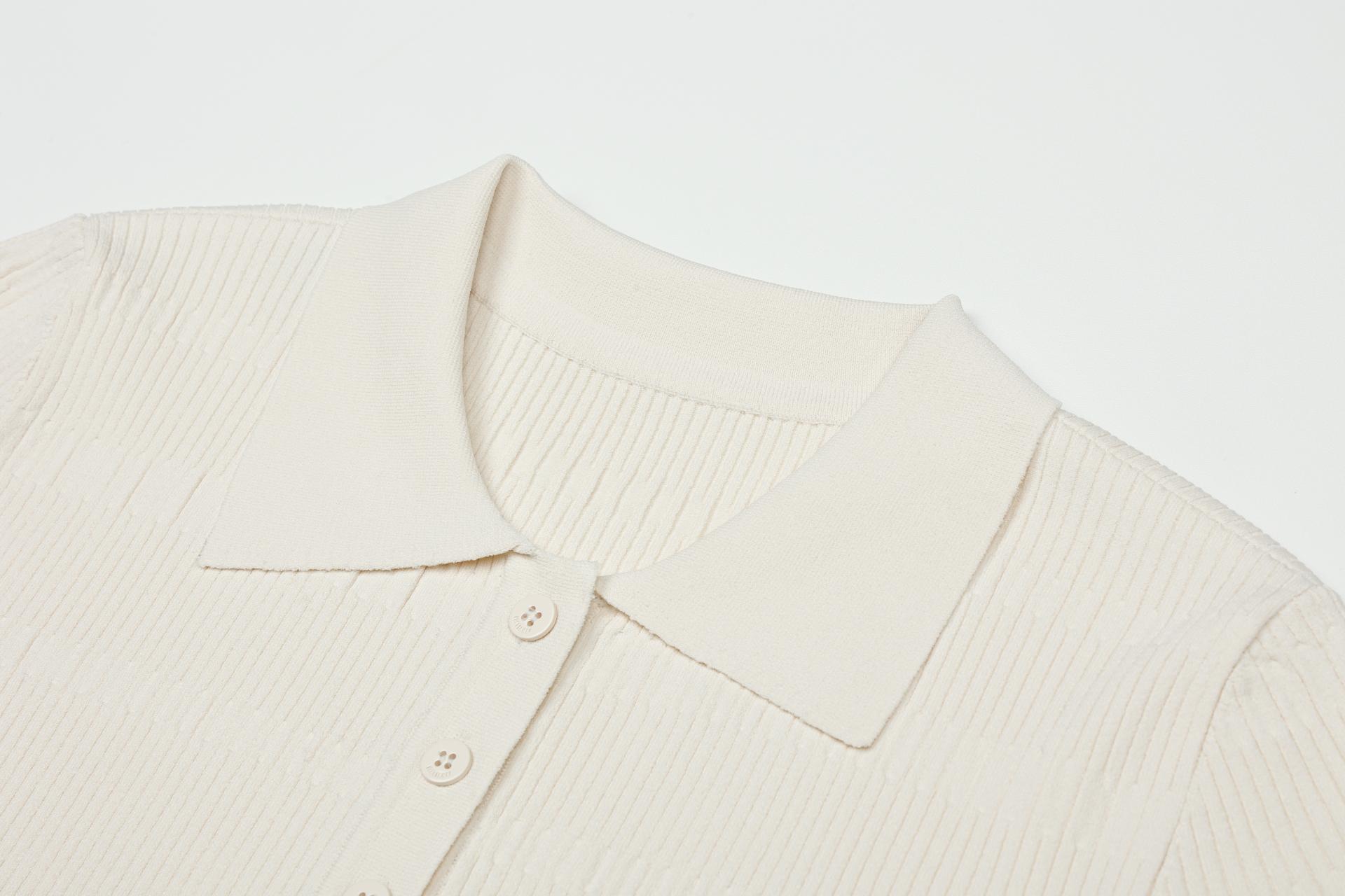 반 오픈 형식의 버튼과 카라 디테일, 부드러운 골조직과 과하지 않은 슬림한 형태의 디자인으로
