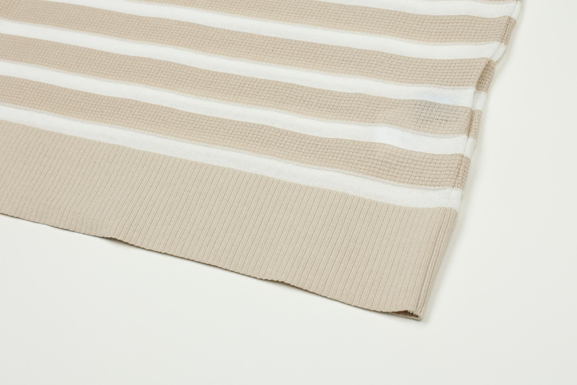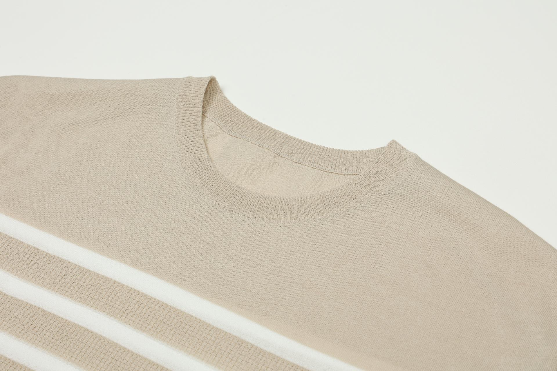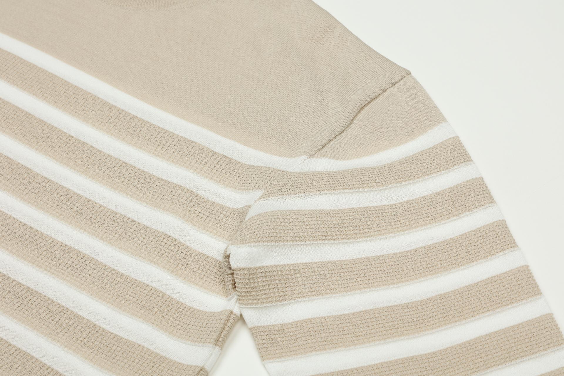 기본 U넥 디자인과 경쾌한 스트라이프 패턴 디자인으로 깔끔한 실루엣을 자아내며, 스트라이프 컬러 블록과 함께 2:1 양두 조직의 믹스 조직으로 디테일을 더했습니다.