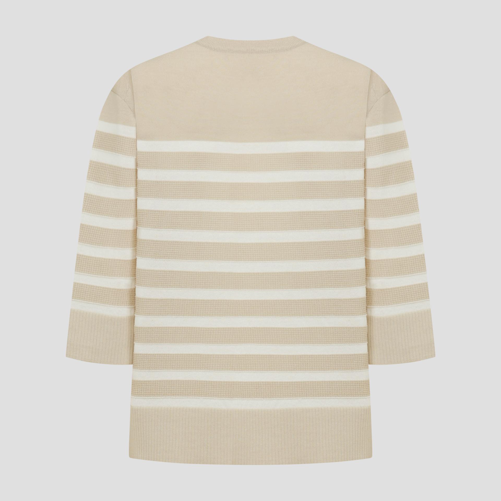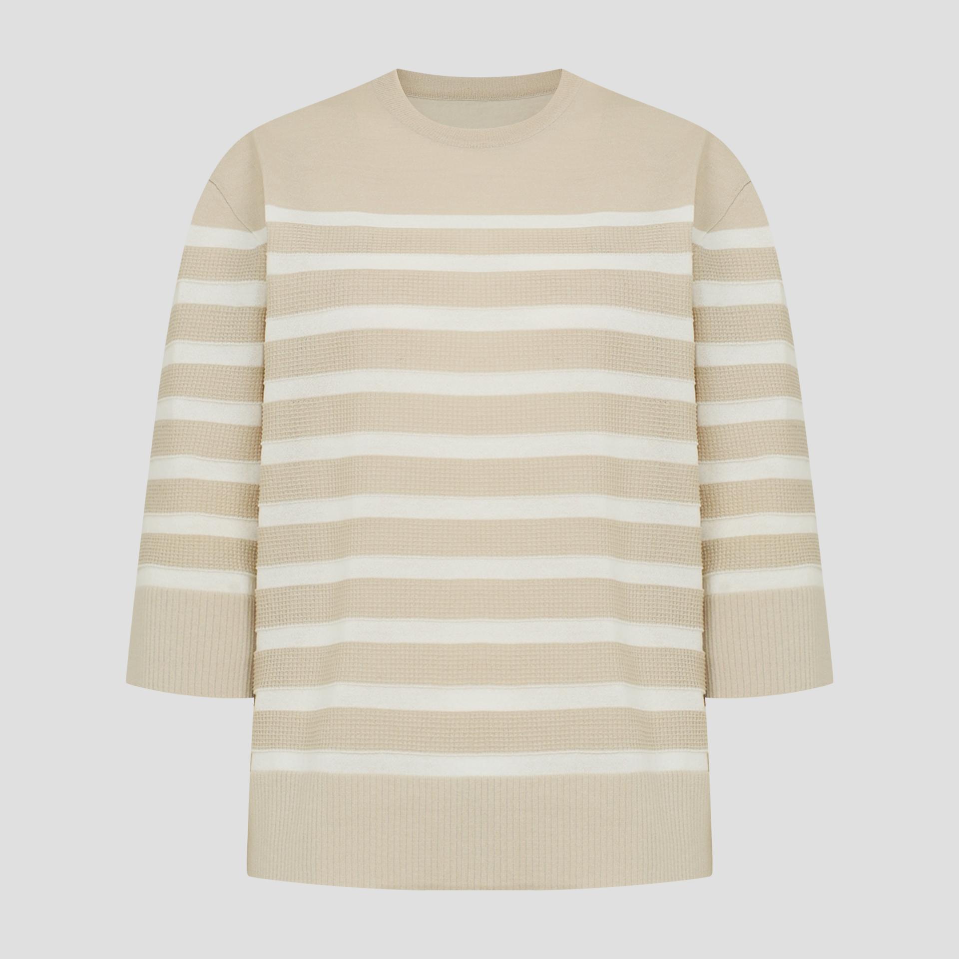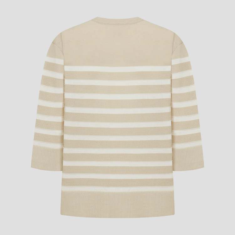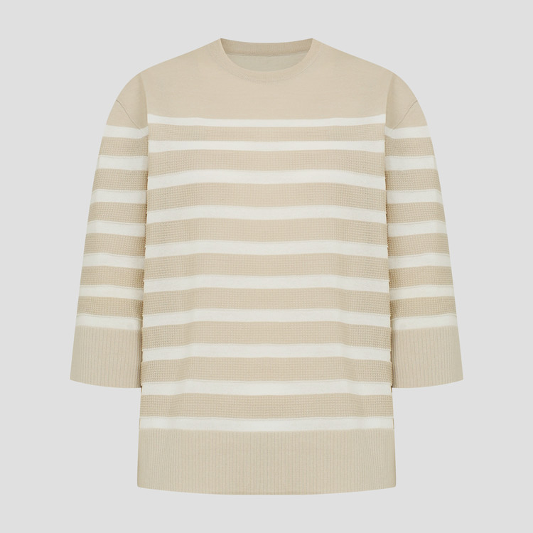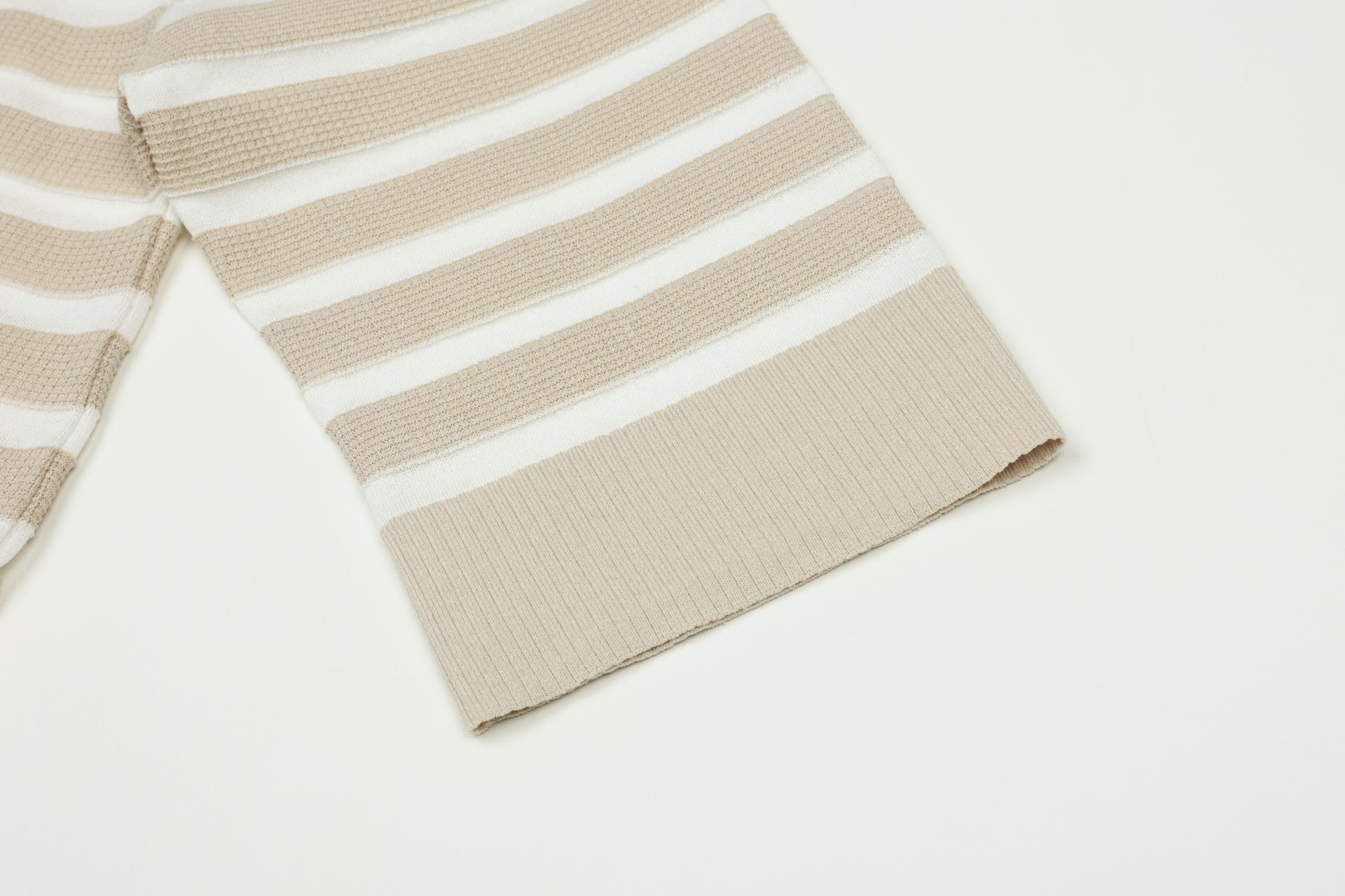 기본 U넥 디자인과 경쾌한 스트라이프 패턴 디자인으로 깔끔한 실루엣을 자아내며, 스트라이프 컬러 블록과 함께 2:1 양두 조직의 믹스 조직으로 디테일을 더했습니다.