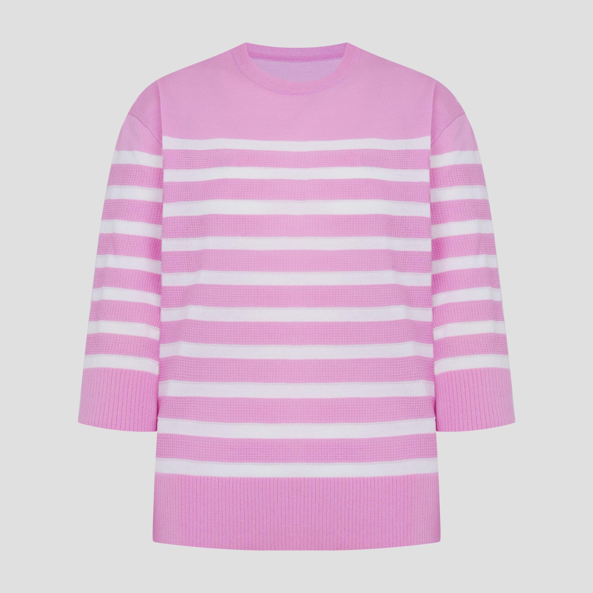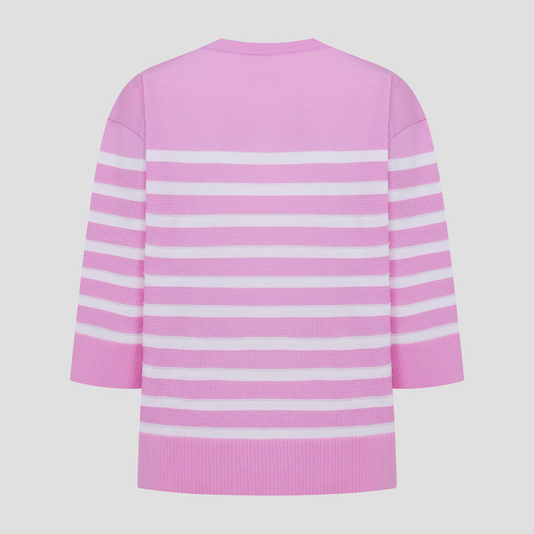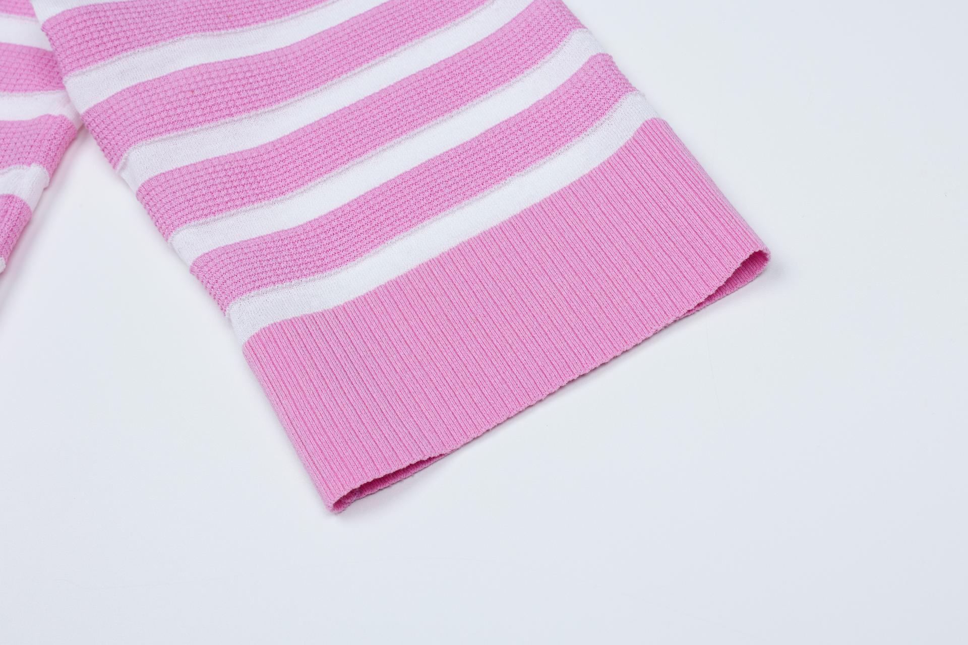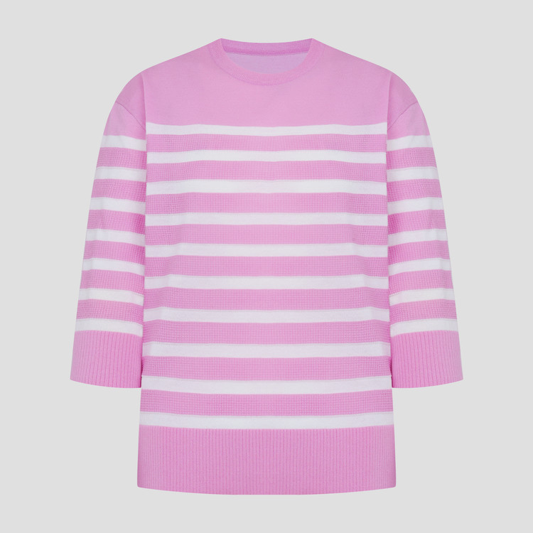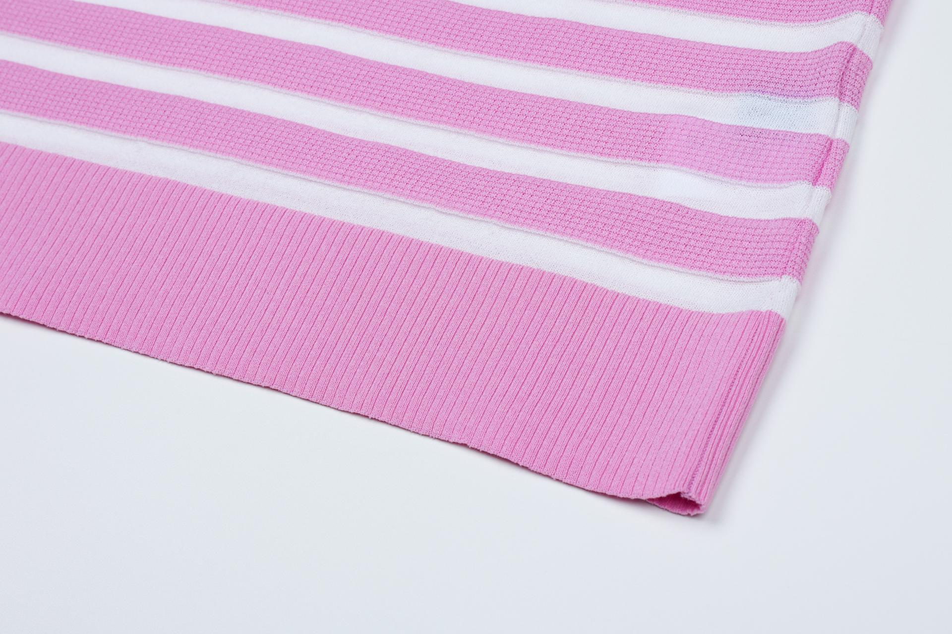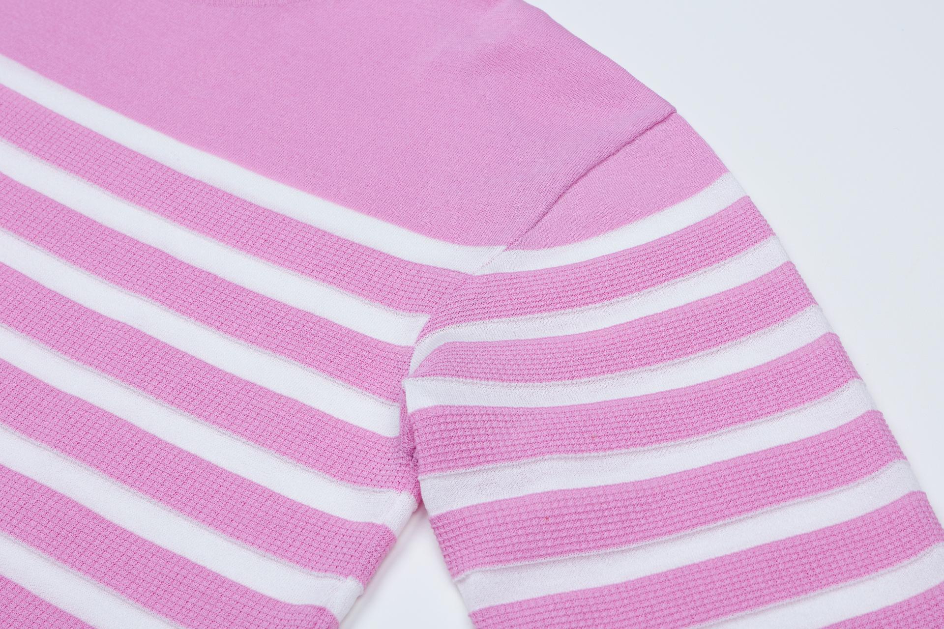 기본 U넥 디자인과 경쾌한 스트라이프 패턴 디자인으로 깔끔한 실루엣을 자아내며, 스트라이프 컬러 블록과 함께 2:1 양두 조직의 믹스 조직으로 디테일을 더했습니다.