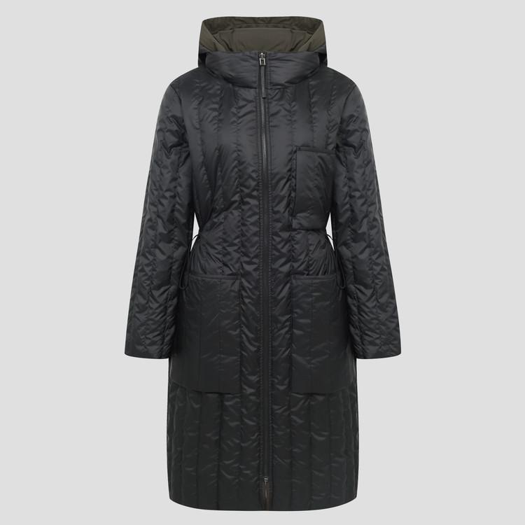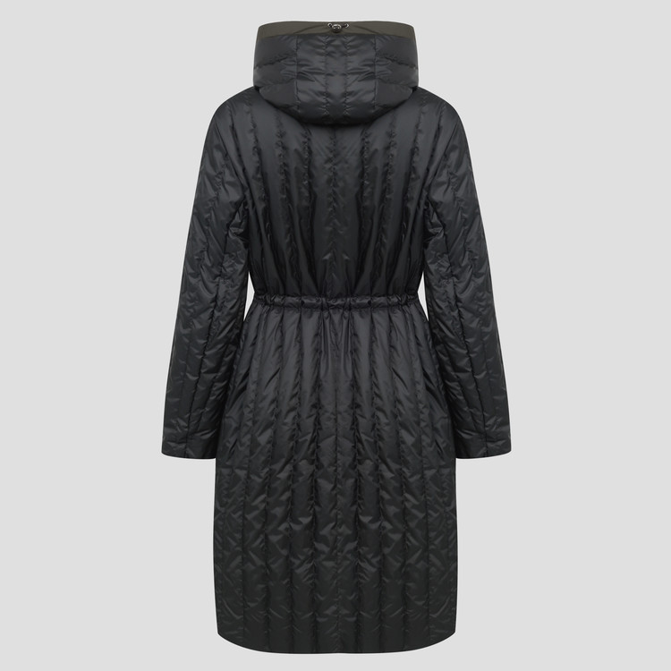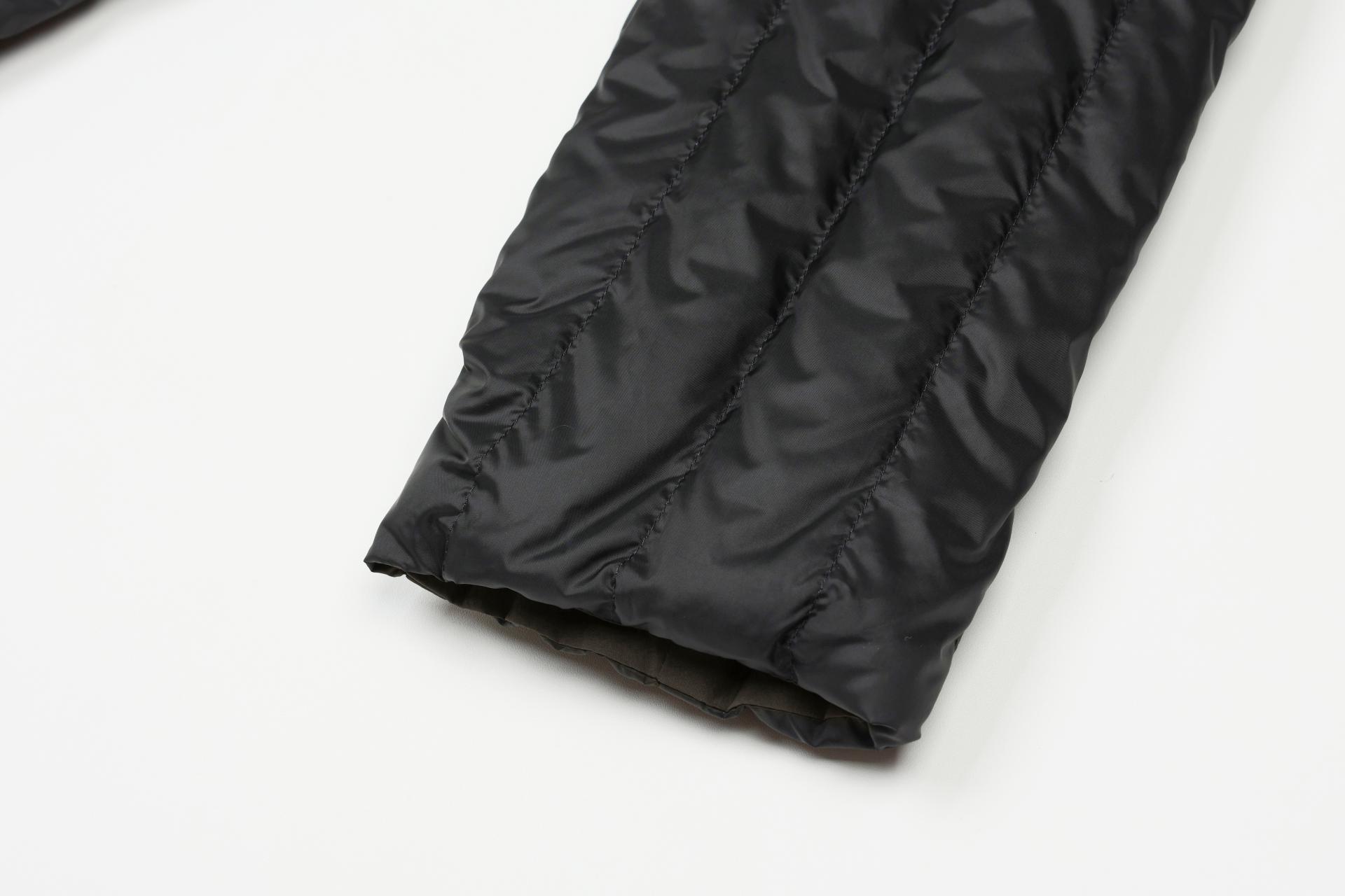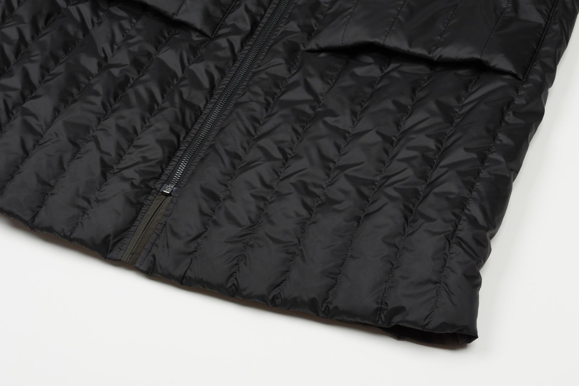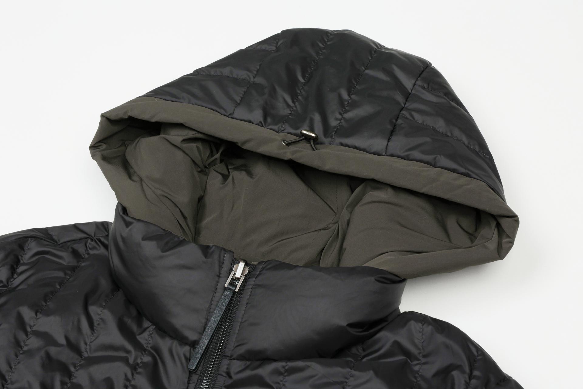 리버시블로 착용 가능한 거위솜털90% 깃털10%의 후드 롱 다운입니다.