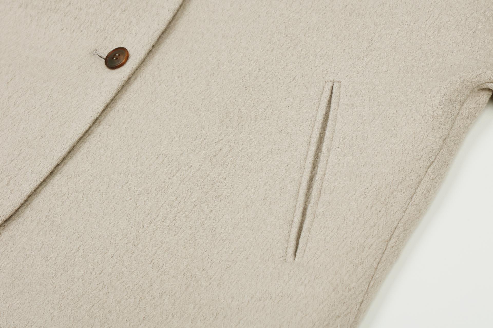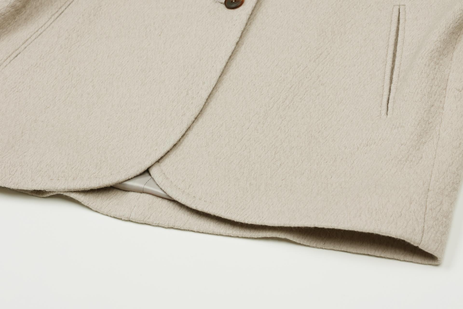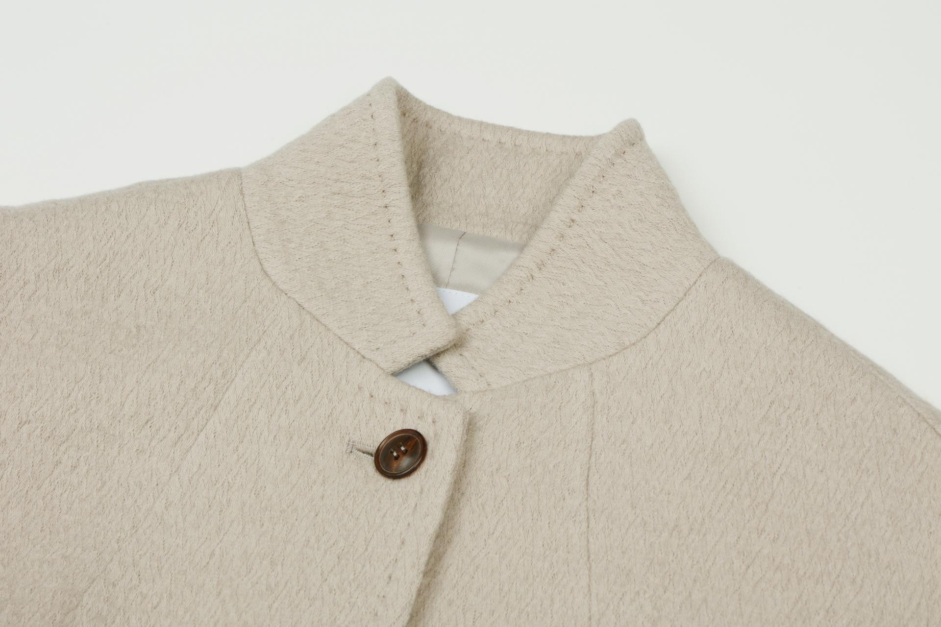 이태리 릴리아사의 수입 소재로 울소재로 독특한 짜임의 외관 소재로 포근한 터치감의 군더더기 없이 간결한 디자인의 자켓입니다.
