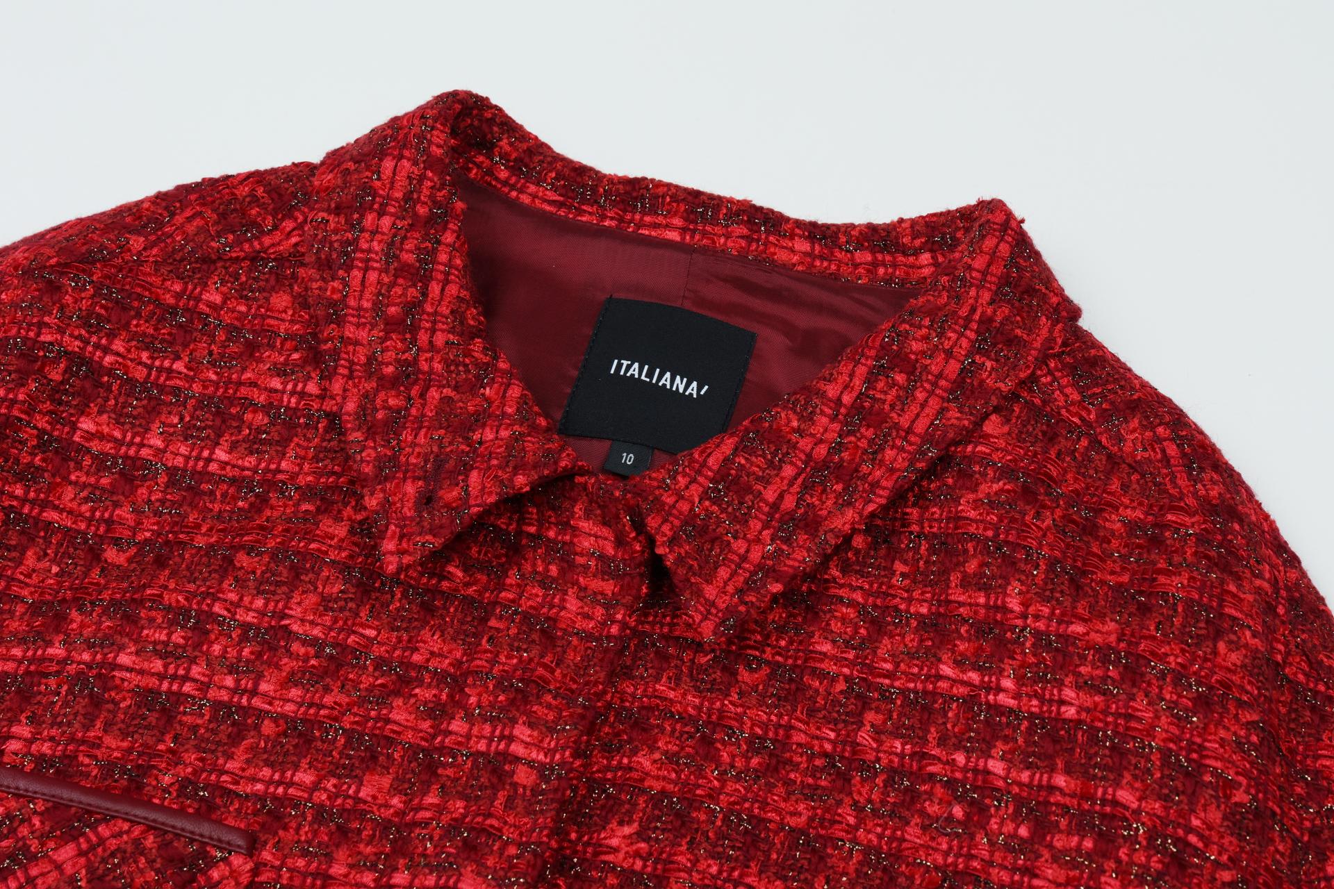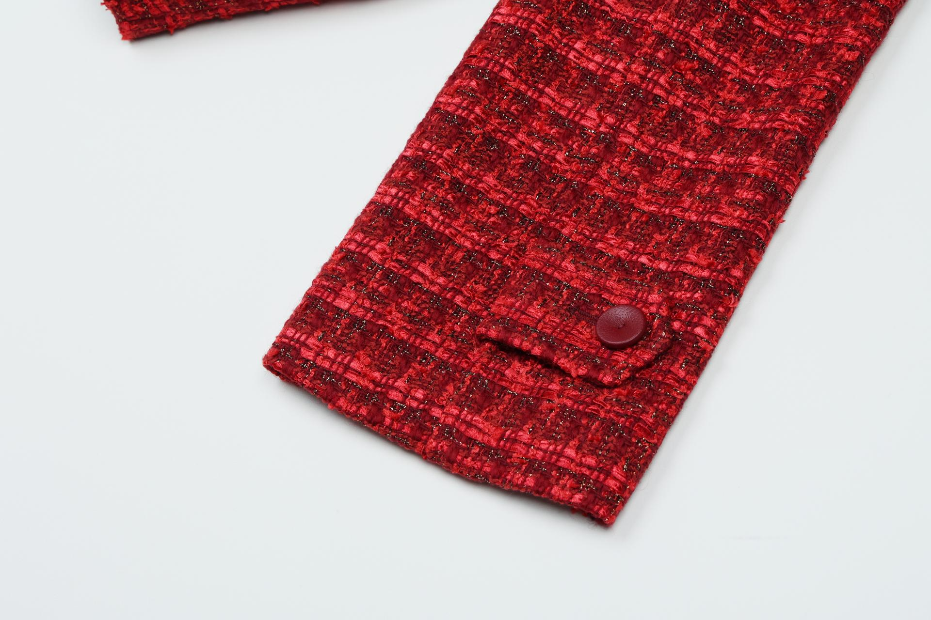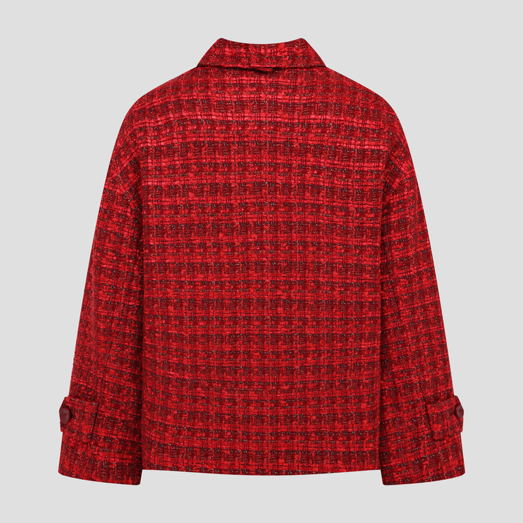 울 혼방 소재의 레드베이스 컬러 원사와 메탈릭한 프린지를 직조해 입체적인 텍스처가 돋보이는 트위드 자켓입니다.