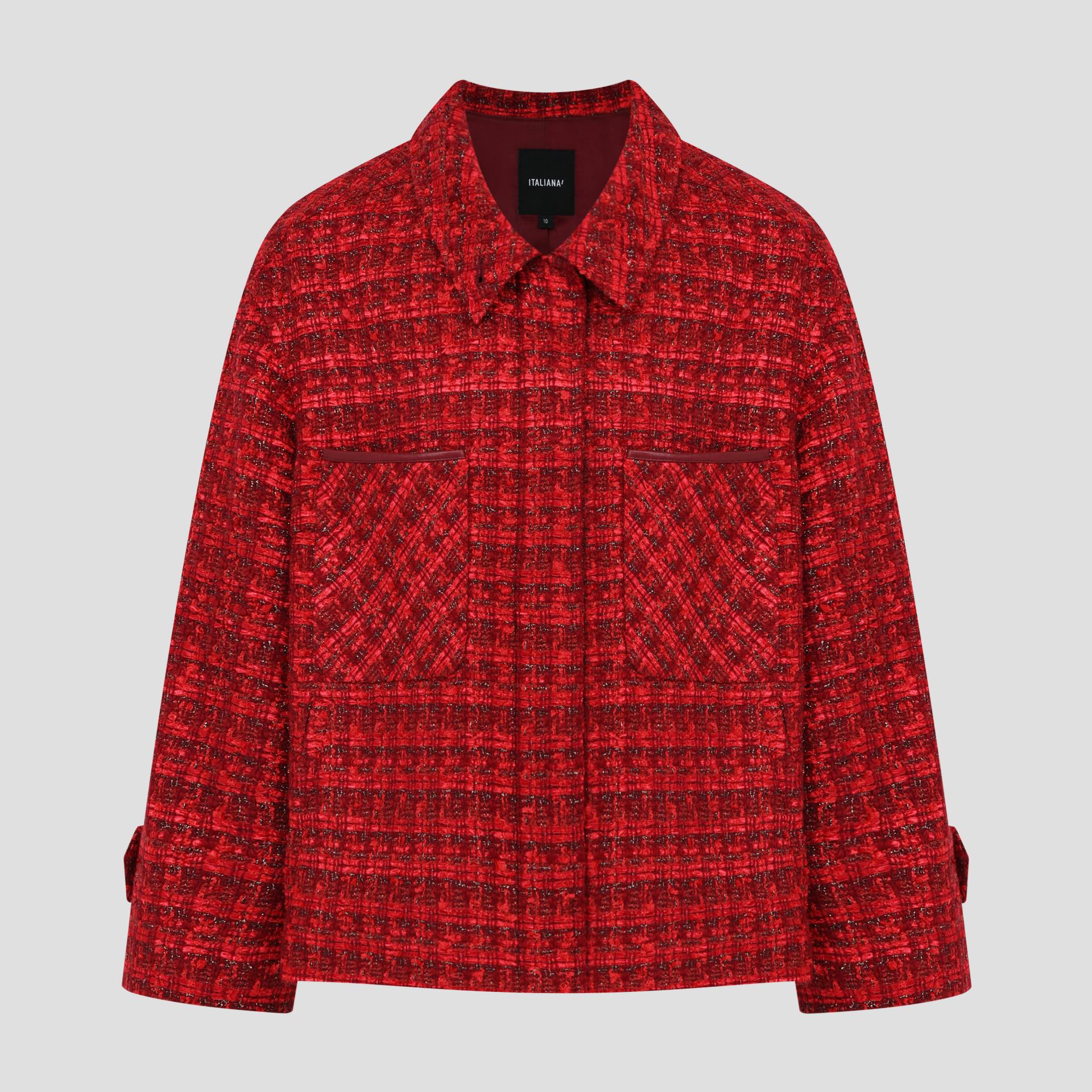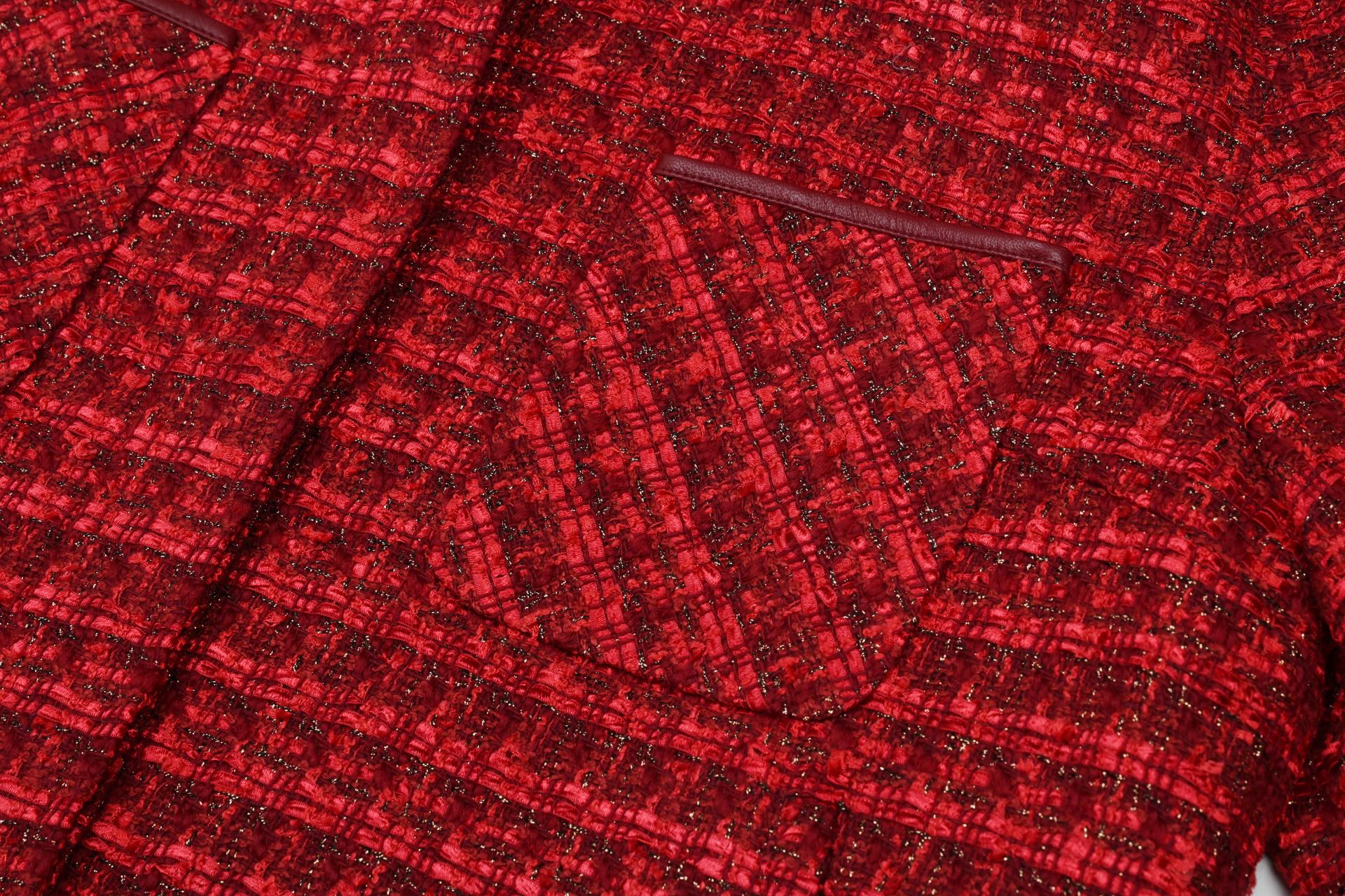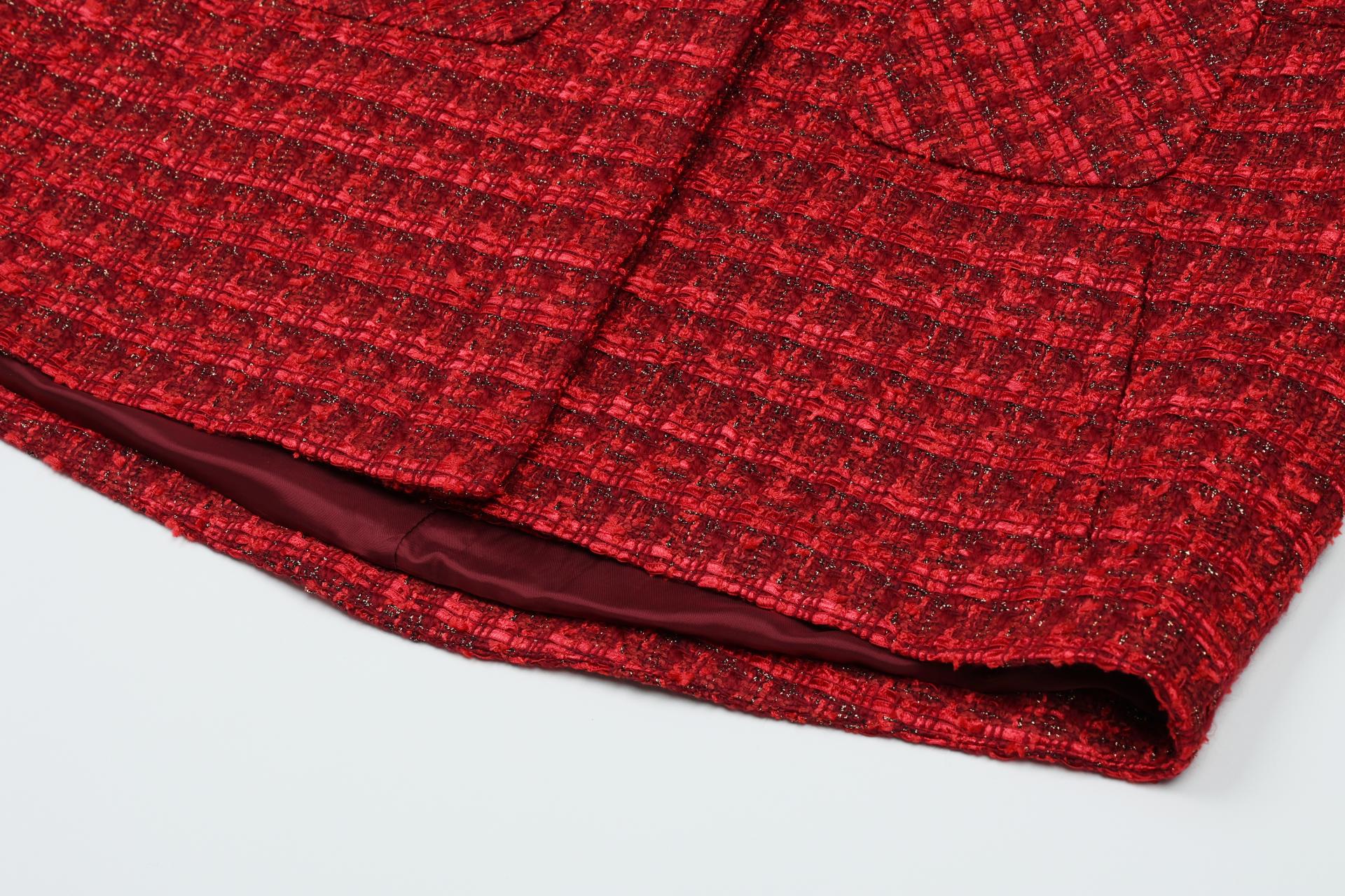울 혼방 소재의 레드베이스 컬러 원사와 메탈릭한 프린지를 직조해 입체적인 텍스처가 돋보이는 트위드 자켓입니다.