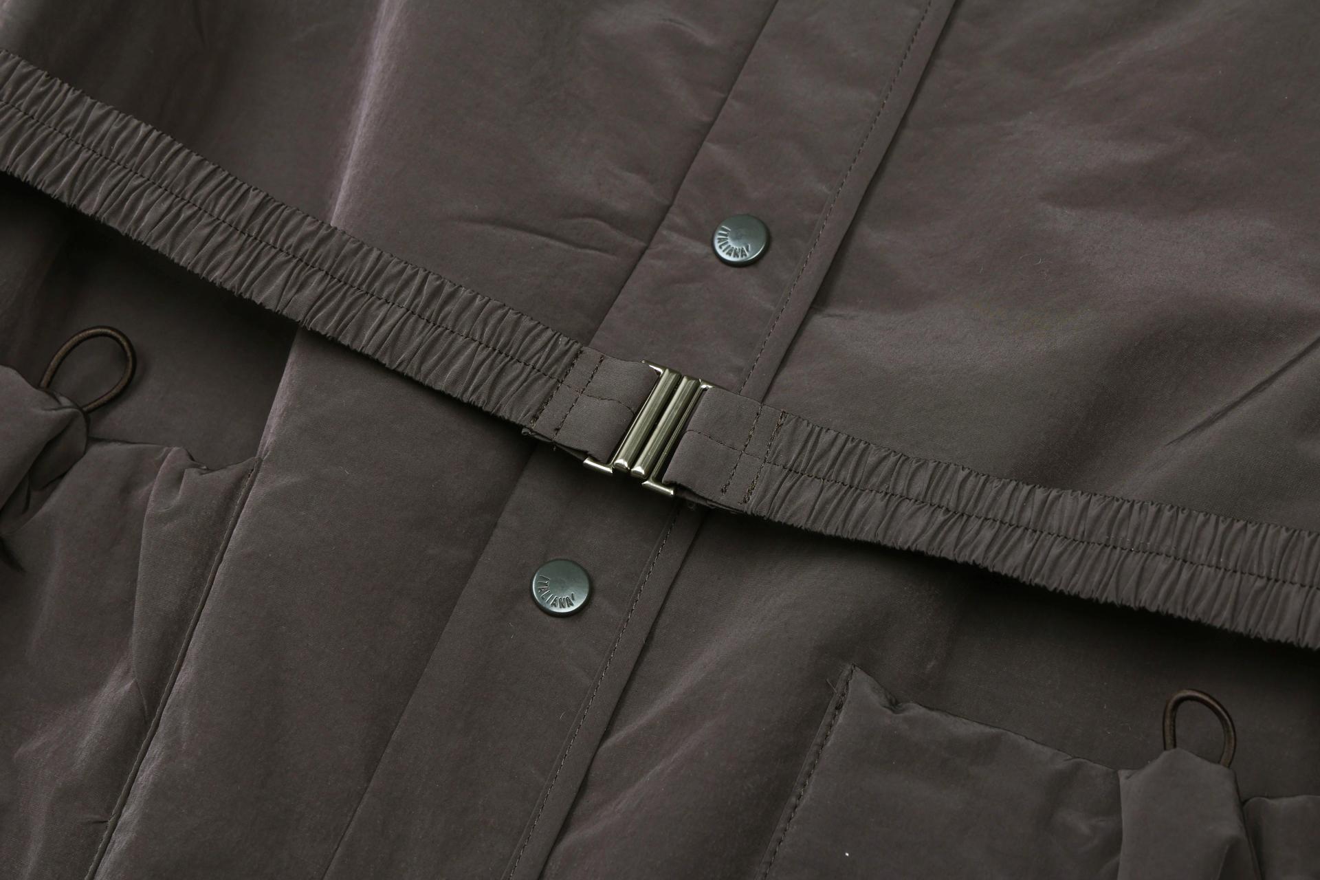 뒷면 허리 라인 내부 양옆에 드로우스트링으로 실루엣 조절이 용이하고, 제감 벨트가 세트로 구성되어 슬림한 라인을 연출할 수 있습니다.