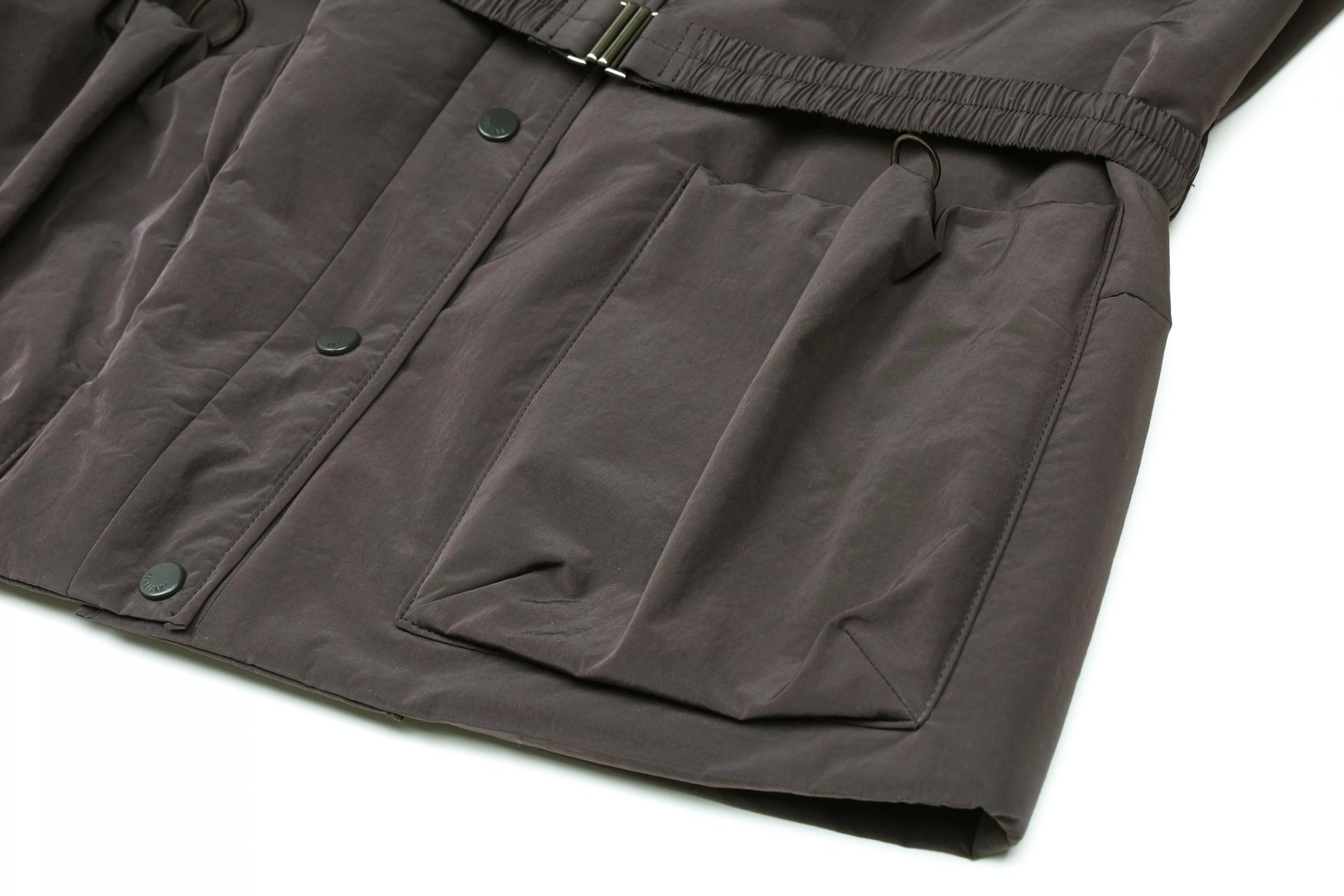 앞면에 스냅 버튼 클로징으로 간편하게 여며지며, 앞판 양 옆에 스트링으로 조절 가능한 큼직한 포켓으로 실용성을 더해주었습니다.