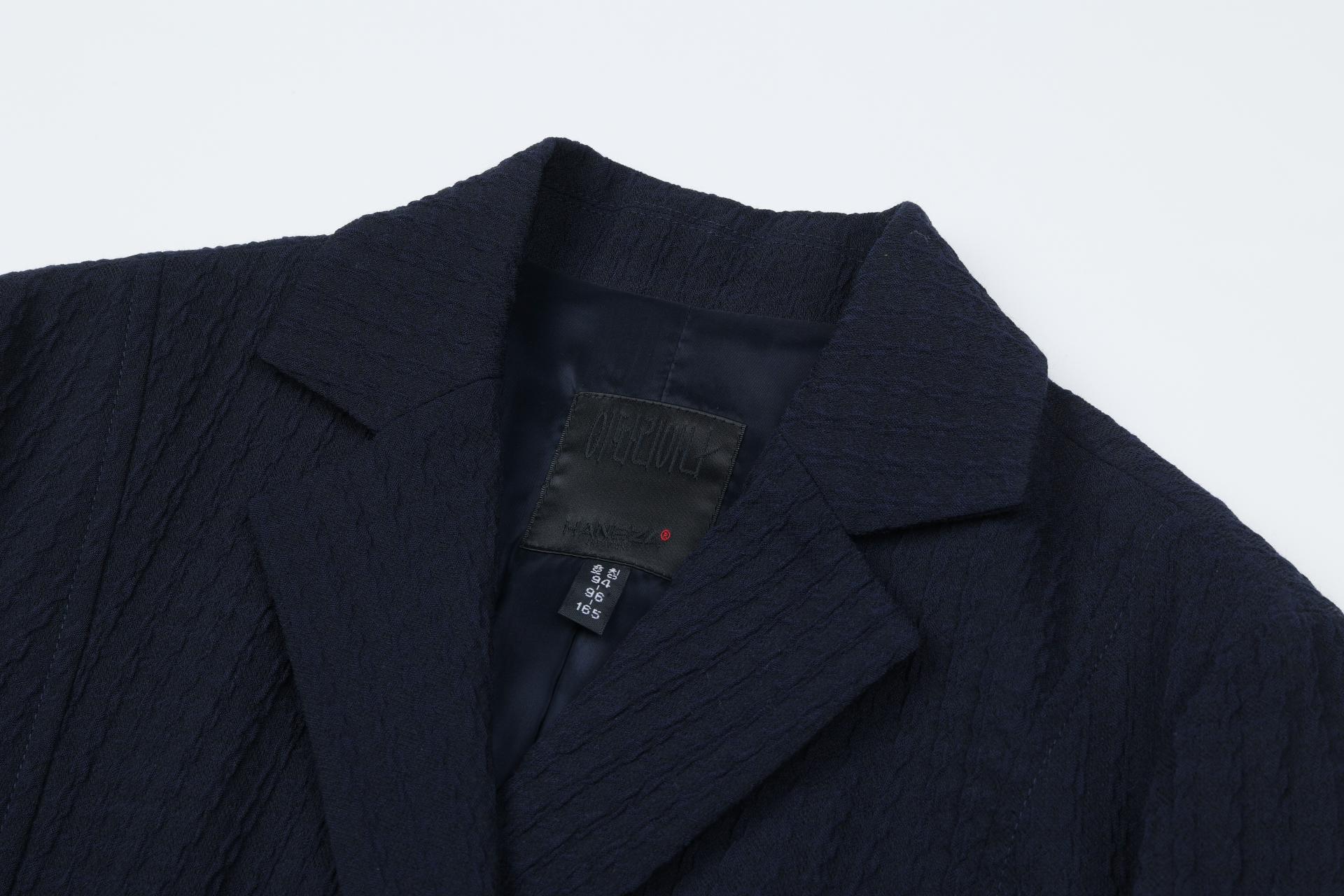 왼쪽 가슴에 대각선 입술 포켓 장식과 포켓 밑으로 양쪽 겹 트임 디테일이 있습니다.